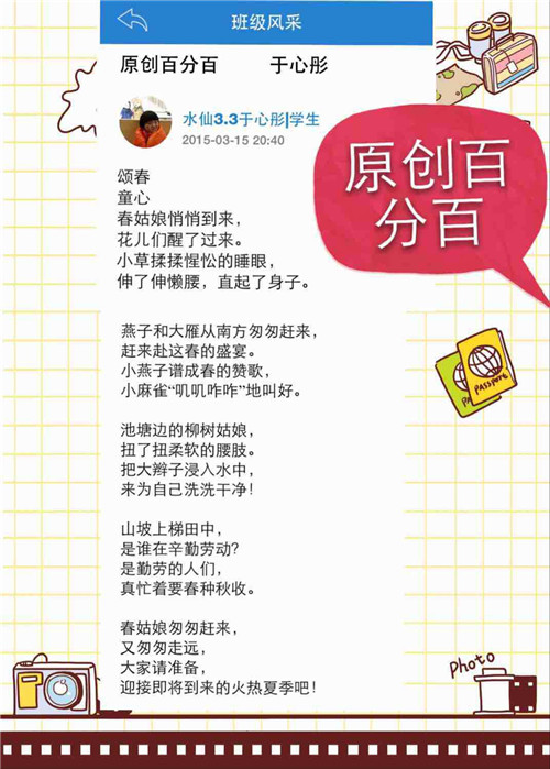 2、原创百分百班级有几位爱好写作的孩子,一直把他们的文章、小诗放在qq群里。现在为他们开设个栏目,专栏专用,家长们反响也不错,欣赏别人孩子佳作时也反思自家孩子,取长补短。