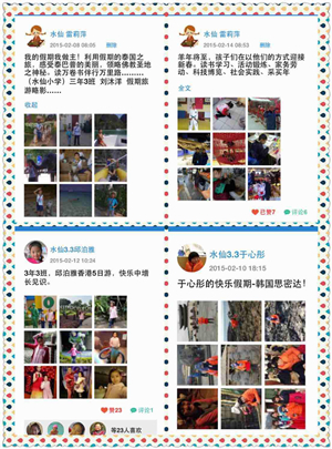 从寒假伊始,孩子们进入假期,大部分学生在家享受假期,读书、锻炼,走亲访友安排的井然有序;也有的家长带着孩子真的走出家门,将旅行进行到底。有的去了吉林、北京等地,也有的去了韩国、香港、泰国。大家晒出自己的旅游,没有炫耀之说,更多的是感受到大自然的美丽,享受亲情与友情。家长们互相交流,读万卷书行万里路之旅----就在知校上跨越时空的实现了。
